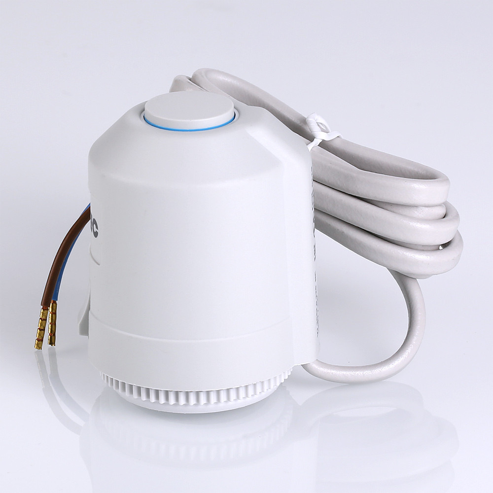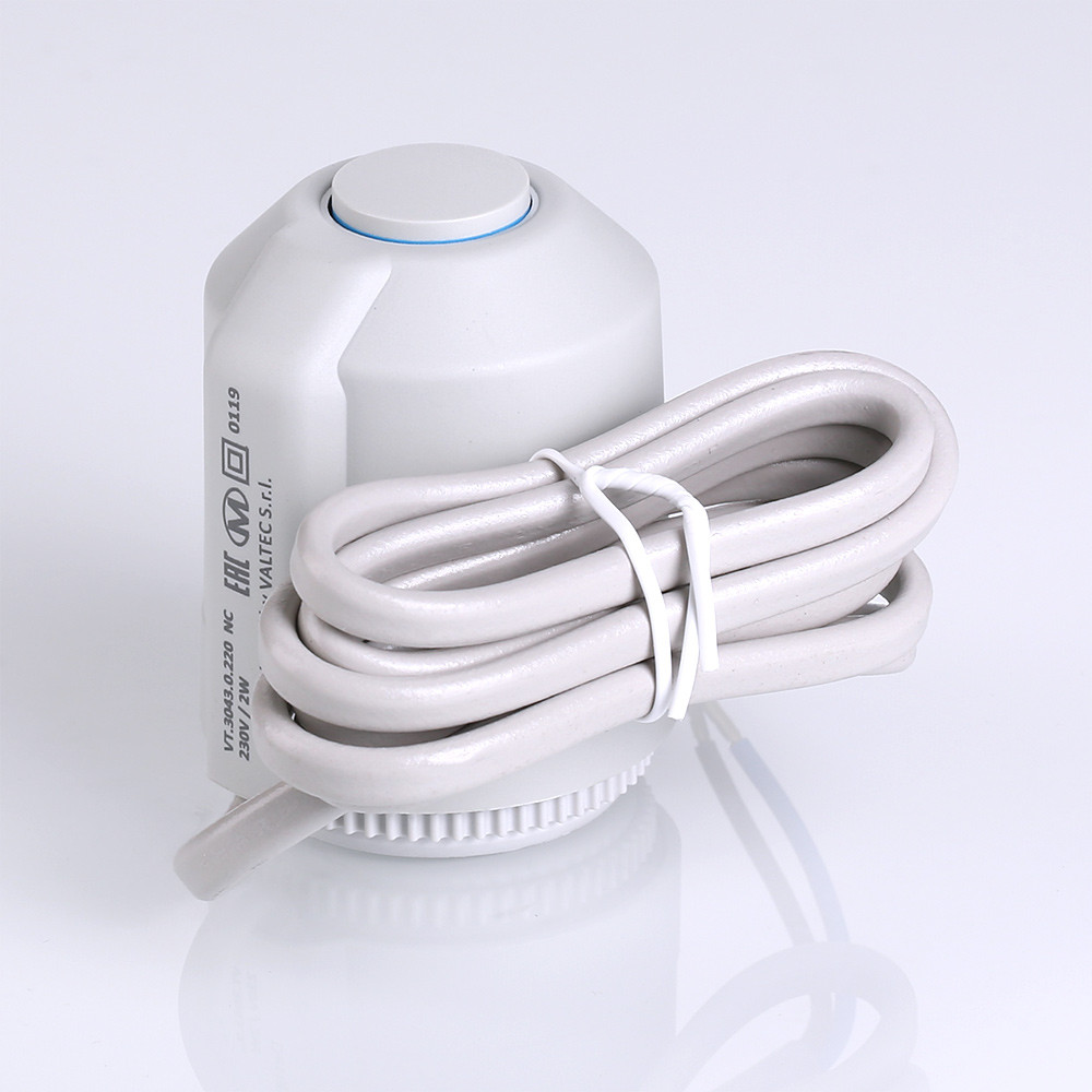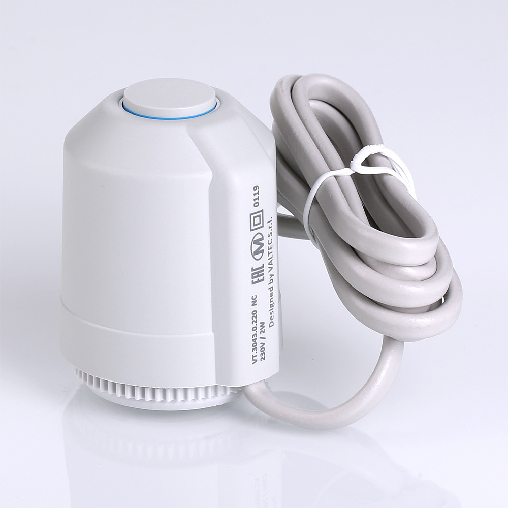 Электротермический двухпозиционный сервопривод VT.TE3043 применяется для автоматического управления радиаторным или коллекторным термостатическим клапаном систем водяного отопления (в том числе теплого пола) и охлаждения зданий. Действие привода основано на расширении заполняющего сильфон армированного парафина при протекании электрического тока через встроенный нагревательный элемент по сигналу от комнатного термостата или контроллера.