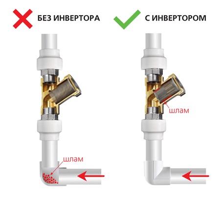 Чтобы исправить такой недостаток на горизонтальном участке, достаточно перевернуть фильтр в правильное положение. На вертикальном трубопроводе при подаче воды снизу-вверх потребуется устройство горизонтального участка, а для этого не всегда есть место и возможность. В данном случае можно заменить косой фильтр на универсальный – VT.386.N – или применить инвертор потока для косого фильтра VT.116.N.