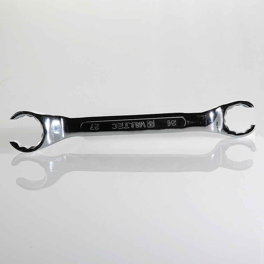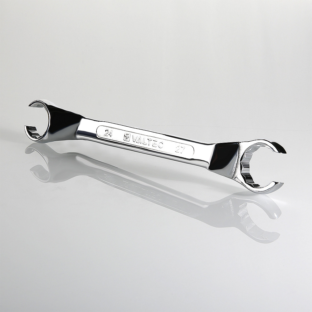 Ключ для коллекторных фитингов – инструмент, значительно облегчающий подключение трубных петель к коллекторам, особенно необходимый монтажникам систем водяного теплого пола, которым часто приходится монтировать оборудование в стесненном пространстве распределительного шкафа. Головки ключа имеют разрезы, через которые удобно продеть присоединенную трубу, предварительно наживив накидную гайку соединителя на отвод коллектора. Конфигурация головки позволяет плотно охватить гайку и произвести ее затяжку. Ключ – двухсторонний, обеспечивает монтаж/демонтаж фитингов стандартов «конус» (1/2”), «евроконус» (3/4”).