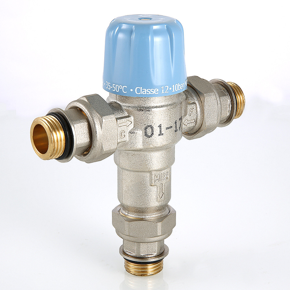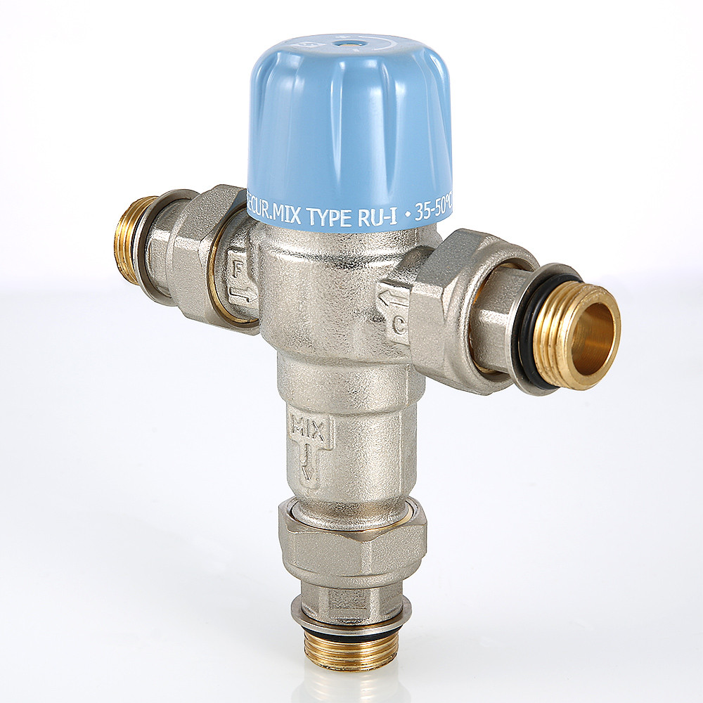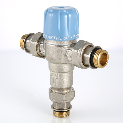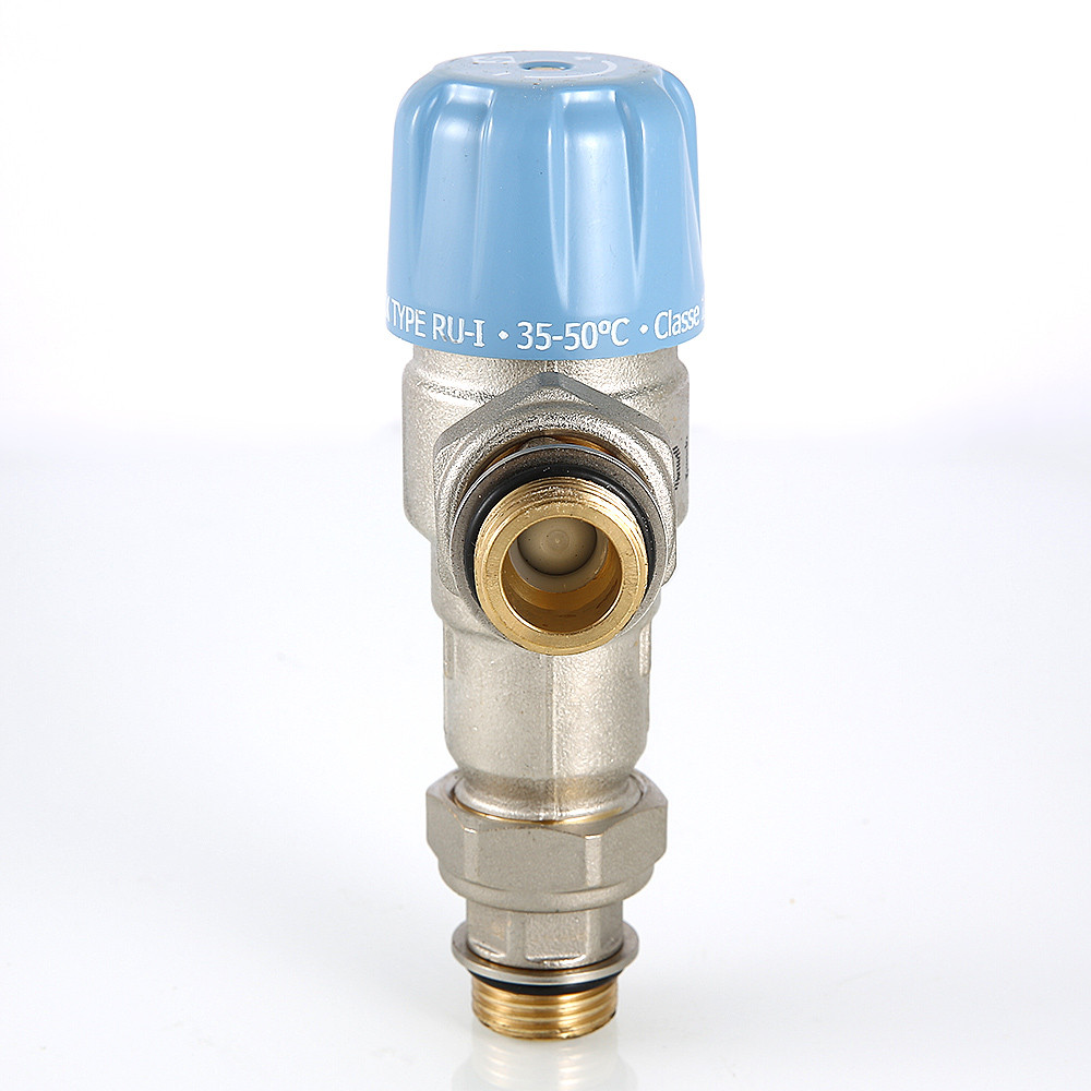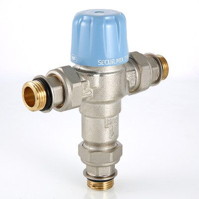 Трехходовой термостатический смесительный клапан с изменяемой в диапазоне от 30 до 50 °C настройкой. Предназначен для автоматического поддержания заданной температуры в системе горячего водоснабжения. Ее превышение исключается даже при полном отключении холодной воды, что позволяет использовать смеситель в школах, детских садах, других общественных зданиях. Термостат оперативно реагирует на изменение температуры и давления входящих потоков. Клапан выполнен из качественной латуни, никелирован. Встроенный термочувствительный элемент – твердотельный (армопарафин). Патрубки клапана соединены накидными гайками с полусгонами. Резьба присоединений – внешняя. Входы смесителя комплектуются обратными клапанами из нейлона. Максимальная температура на входе горячей воды – 90 °C, допустимое рабочее давление входных потоков – до 10 бар.