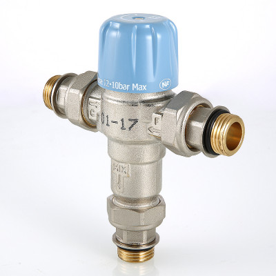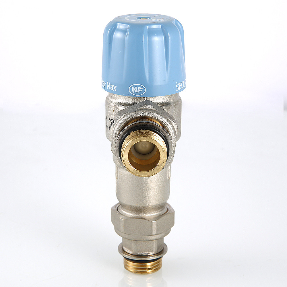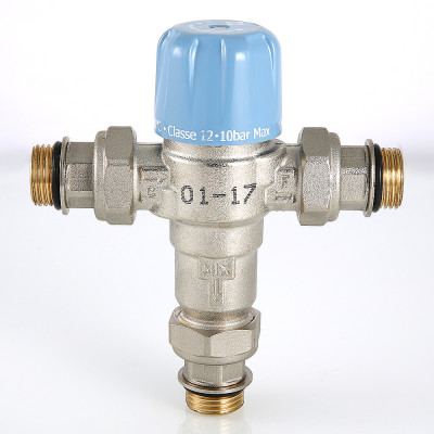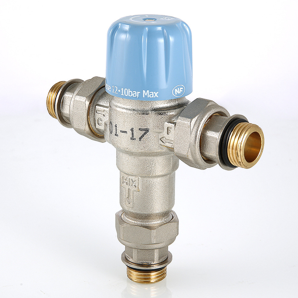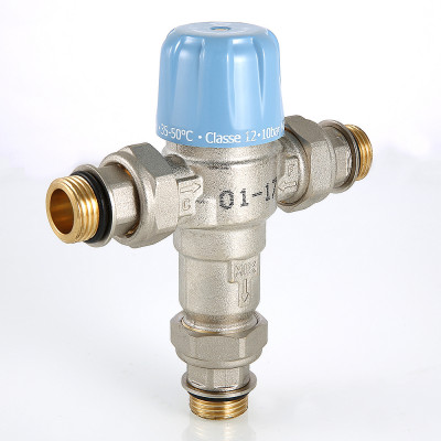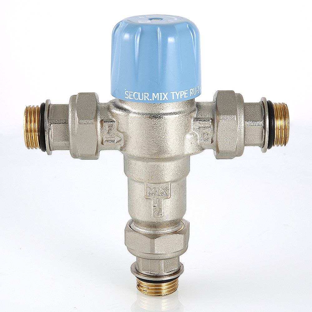 Трехходовой термостатический смесительный клапан с изменяемой в диапазоне от 30 до 50 °C настройкой. Предназначен для автоматического поддержания заданной температуры в системе горячего водоснабжения. Ее превышение исключается даже при полном отключении холодной воды, что позволяет использовать смеситель в школах, детских садах, других общественных зданиях. Термостат оперативно реагирует на изменение температуры и давления входящих потоков. Клапан выполнен из качественной латуни, никелирован. Встроенный термочувствительный элемент – твердотельный (армопарафин). Патрубки клапана соединены накидными гайками с полусгонами. Резьба присоединений – внешняя. Входы смесителя комплектуются обратными клапанами из нейлона. Максимальная температура на входе горячей воды – 90 °C, допустимое рабочее давление входных потоков – до 10 бар.