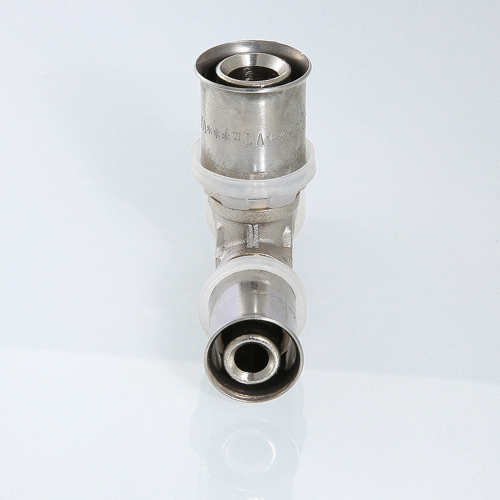 Пресс-фитинг – тройник предназначен для соединения трех труб – металлопластиковых, из сшитого полиэтилена или полиэтилена повышенной термостойкости. Корпус выполнен из сантехнической латуни марки CW617N, уплотнительные кольца штуцеров – из EPDM плотностью 1,22 г/см3, пресс-гильзы – из нержавеющей стали. Нейлоновая обойма выполняет функции фиксатора гильзы, направляющей для пресс-насадок и диэлектрической прокладки, прерывающей контакт между алюминием трубы и латунью корпуса. Конструкция пресс-фитингов VALTEC обеспечивает повышенную пропускную способность, надежность соединений, прочность и термостойкость. Монтаж фитинга производится пресс-инструментом с насадкой «ТН». Типоряд содержит равнопроходные и переходные пресс-тройники.