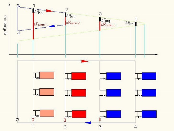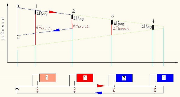 Принцип монтажной настройки отопительных приборов двухтрубной системы отопления можно иллюстрировать примером, показанным на рис. 4.
