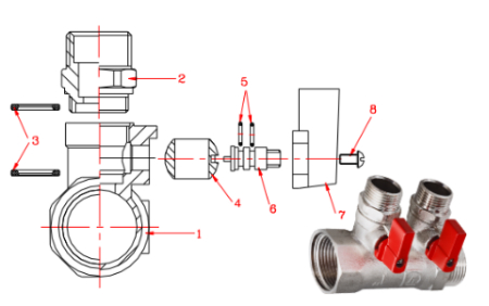 На рис. 2 показан вариант «сложного» коллектора – VT.580.N (NE), выходы которого оснащены отсекающими кранами. Конструкция этого коллектора включает в себя латунный никелированный корпус 1 с присоединенными к нему выходными патрубками 2 (их соединение произведено на резьбе и герметизировано клеем анаэробного твердения Loctite, допущенным для контакта с пищевыми жидкостями). В отводах корпуса между выполненными из РТFE (тефлона) седельными прокладками 3 расположены шаровые затворы 4 – латунные, с хромовым гальванопокрытием. Затвор приводится в движение латунным штоком 6, уплотнение которого обеспечивается двумя сальниковыми EPDM-кольцами 5. Перекрытие потока осуществляется поворотом на 90º выполненной из ABS ручки 7, крепление которой к штоку производится с помощью винта 8.