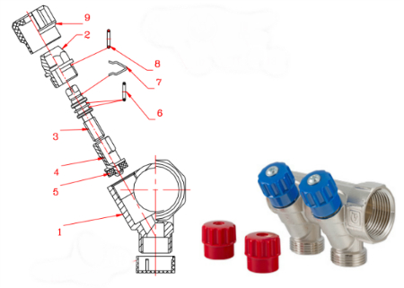 Конструкция коллекторов VTc.560 (рис. 3) содержит латунный никелированный корпус 1. Вращение латунного штока 3 приводит к линейному перемещению ползуна золотника 4 со сменной золотниковой EPDM-прокладкой 5, которая крепится к штоку винтом. Шток фиксируется пружинной скобой 7. В качестве сальникового уплотнения штока используются два кольца 6 из EPDM. Латунная вентильная муфта 2 имеет резьбовое присоединение к корпусу. Герметичность этого соединения обеспечивается прокладочным кольцом из EPDM 8. Регулировка расхода через вентиль производится вращением ручки 9, выполненной из пластика ABS. Коллектор комплектуется набором ручек красного и синего цвета.