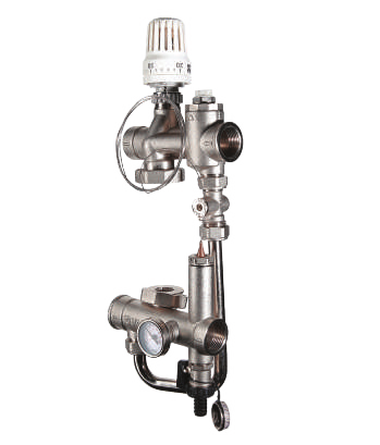 Конструкция узла предусматривает перепускной контур с балансировочным клапаном, сохраняющим неизменным расход теплоносителя в первичном контуре при перекрытии петель тёплого пола.