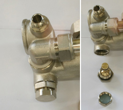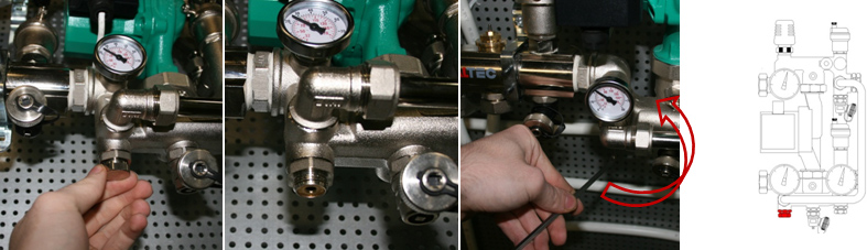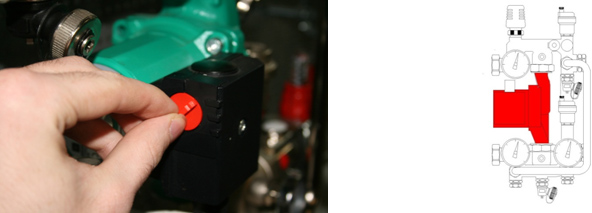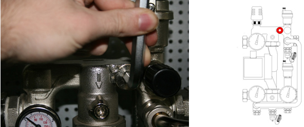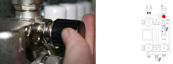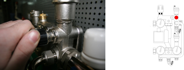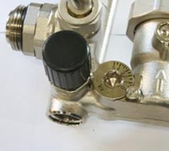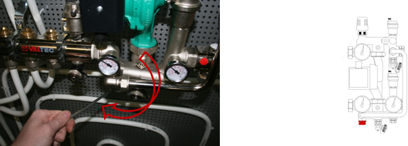 Закрываем Балансировочно-запорный клапан первичного контура. Для этого откидываем крышку клапана и шестигранным ключом поворачиваем клапан против часовой стрелки до упора.