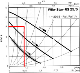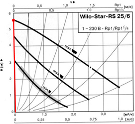 В данном примере видно, что насос в случае отсутствия движения воды на первой скорости имеет давление 3,05 м.в.ст (0,3 бар);