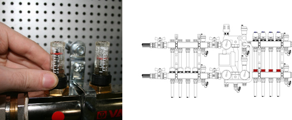 Контролировать расход теплоносителя можно при помощи расходомеров или контролируя температуру теплоносителя в обратном трубопроводе тёплого пола.