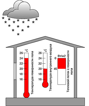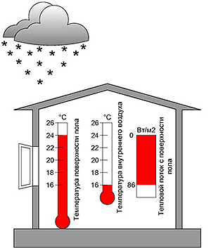 На улице холодно, солнца нет, открыто окно. Температура поверхности пола составляет 24 °С, а температура воздуха в помещении снизилась до 16 °С за счет увеличения теплопотерь и поступления через окно холодного воздуха. Разность температур между поверхностью пола и внутренним воздухом значительно возросла. Тепловой поток составляет 86 Вт/м2.