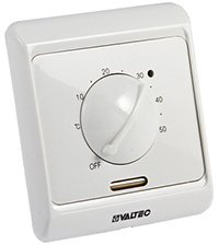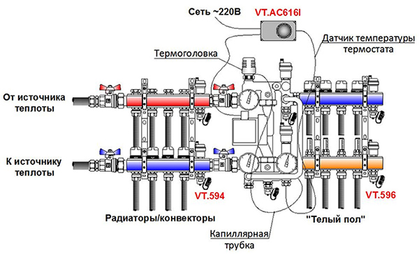 1) Термостат VT.AC601 (рис. 7), работающий от встроенного датчика температуры окружающего воздуха. При снижении температуры воздуха в помещении термостат подает питание на привод, который открывает клапан.