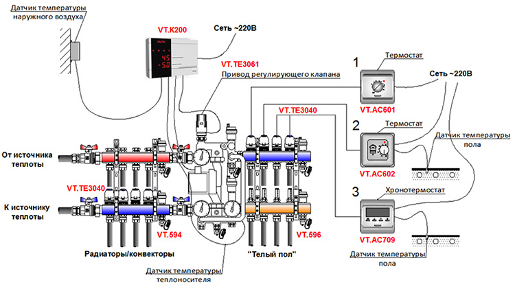 Контроллер VALTEC VT.K200 позволяет по заданному графику корректировать температуру теплоносителя в соответствии с температурой наружного воздуха. Температура теплоносителя в подающем коллекторе теплого пола регулируется с помощью аналогового сервопривода VT.TE3061, посредством управляющего сигнала от контроллера. Управляющий сигнал контроллера рассчитывается по пропорционально-интегрально- дифференциальному (ПИД) закону регулирования.