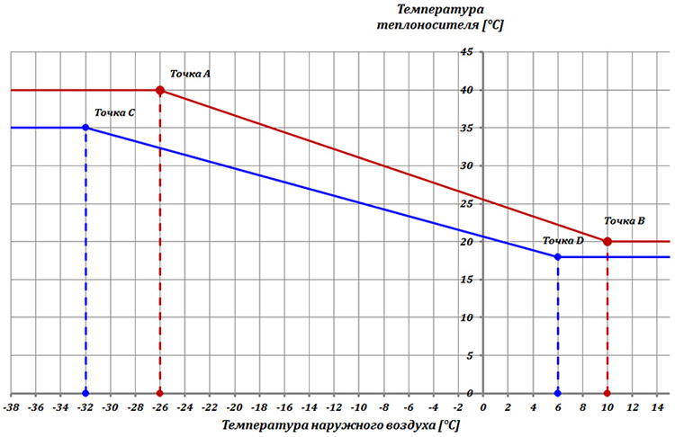 Крайняя левая точка графика (рис. 12, точка А или С) задает максимальную температуру теплоносителя в системе теплого пола, которой соответствует расчетная отрицательная температура наружного воздуха.
