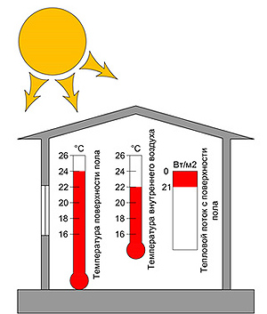 На улице холодно, солнца нет. Температура поверхности пола составляет 24, воздуха в помещении – 20 °С. Из-за разности этих значений происходит теплообмен между поверхностью пола и внутренним воздухом. Тепловой поток составляет ≈ 45 Вт/м2.