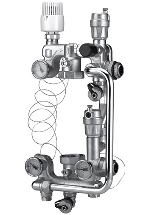 Узел предназначен для поддержания заданной температуры и расхода теплоносителя во вторичном контуре системы отопления, гидравлическую увязку первичного и вторичного контуров. Он оснащен всей необходимой запорно-регулировочной арматурой и сервисными элементами и обеспечивает стабильную работу вторичного контура и предохраняет насос от работы «на закрытую задвижку», что увеличивает срок его безаварийной службы.