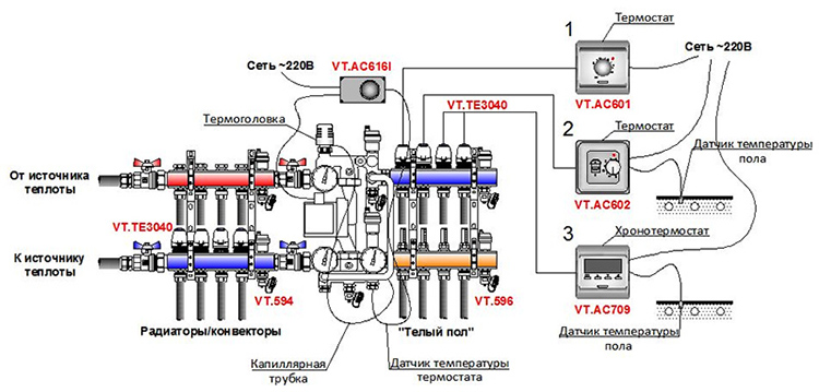 Рассматриваемые в статье комнатные термостаты VT.AC601, 602, 709 работают только от сети 220 В и управляют в системах отопления только нормально закрытыми сервоприводами.