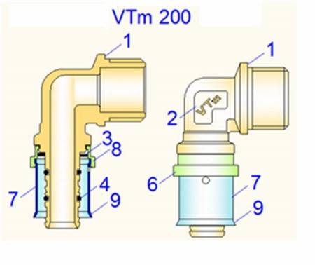 Для соединения труб VALTEC разработаны две серии фитингов: обжимные – VTm.300 – и пресс-фитинги – VTm.200. Литера «m» в маркировке соединителей – типовое окончание марки фитингов для металлополимерных труб, от итальянского слова «multistratо» (многослойная).