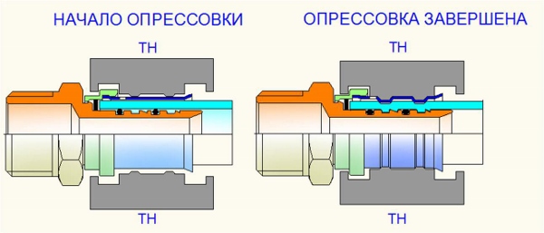 В процессе опрессовки происходит деформация стенок трубы, внутренний слой частично вдавливается в проточки штуцера, создавая прочное, герметичное соединение, защищенное от сползания.