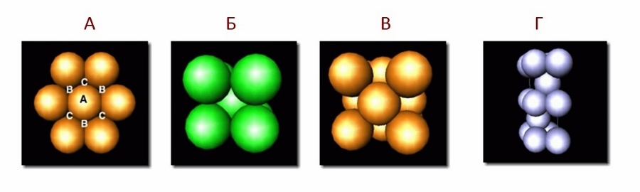 Каждое фазовое состояния характеризуется своей электронно-кристаллической решеткой. Характерная для чистой меди кубическая плотноупакованная (КПУ) решетка (рис. 1, А) обуславливает мягкость и ковкость материала. В латуни такая же решетка обнаруживается в -фазе. Для чистого цинка присуща гексагональная плотноупакованная (ГПУ) решетка (рис. 1, Г), придающая материалу твердость и хрупкость. Этим характеризуется -стадия латуни. Кубическая объемно-центрическая решетка (ОЦК), рис. 1, Б, и кубическая гране-центрическая решетка (ГЦК), рис. 1, В, соответствуют β- и γ-фазам латуни.