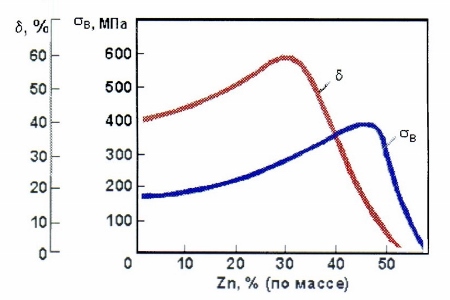 Рис. 2. Зависимость показателей прочности и пластичности латуни от содержания цинка