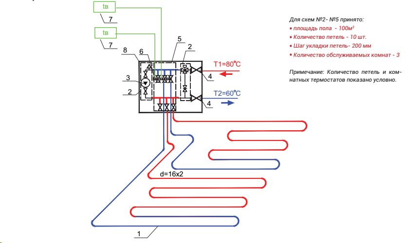 Такая схема используется при теплоносителе в подающем трубопроводе с температурой до 60 °С. При более высоких температурах теплоносителя необходимо применять специальные технические решения (частичное использование «теплой стены»; применение поризованных стяжек, теплоизоляция труб). К преимуществам данной схемы относится ее простота и экономичность. Её рекомендуется использовать при укладке теплого пола в небольших помещениях, учитывая, что один монтажный узел VT.ICBOX может обслужить только одну петлю теплого пола протяженностью не более 100 м. Коллектор и насосно-смесительный узел для такой схемы не требуются.
