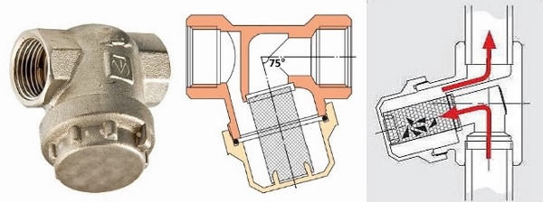 В таких случаях необходимо делать горизонтальный участок трубопровода с установкой на нем ФГО. Однако не всегда рабочее пространство позволяет это сделать. На выручку приходит универсальный фильтр VALTEC VT.386 (патент № 2464479). У этого фильтра ось фильтровальной камеры развернута на 75° по отношению к оси трубопровода. Благодаря этому нерастворимые частицы, окалина и прочие загрязнения не имеют возможности поспасть обратно в трубу, опуститься вниз при остановке потока, а остаются в фильтровальной камере (рис. 8).