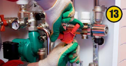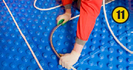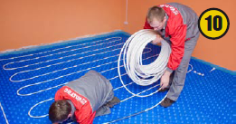 Следующий этап — монтаж и укладка металлополимерных труб теплого пола. Их укладывают в виде «змейки» или «улитки». (10). Форма петель зависит от геометрии помещения. Расстояние между трубами влияет на теплоотдачу всей системы напольного отопления, поэтому оно должно точно соответствовать проектной документации. Трубы закрепляют в пазах между специальными выступами плит — бобышками. Важно не повредить трубы при изгибе, поэтому лучше всего пользоваться пружинным кондуктором (11).