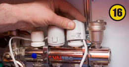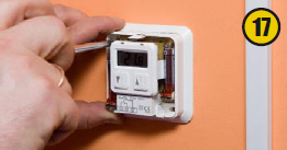 На коллекторах устанавливают сервомоторы (16), регулирующие температуру при помощи комнатных термостатов (17).Сервомоторы и термостаты подключают к коммуникатору (18), который позволяет управлять циркулярным насосом насосно-смесительного узла — включать и выключать систему отопления пола по мере необходимости. По сигналу термостата сервомотор открывает или закрывает ветку теплого пола.