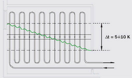 При укладке “одиночный змеевик” (рис.2) распределение температуры поверхности пола не равномерное.