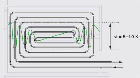При спиральной укладке (рис.3), трубы с противоположными направлениями потоков чередуются, причем наиболее горячий участок трубы соседствует с наиболее холодным. Это приводит к равномерному распределению температуры по поверхности пола.