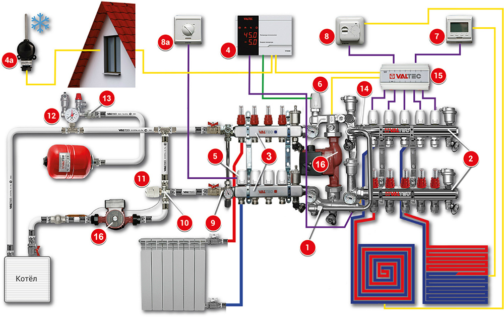 Вашему вниманию предлагается пример современной энергоэффективной системы отопления на базе оборудования VALTEC. Она разработана для загородного дома или любого другого объекта с автономным источником тепла (котлом и т.д.). Схема предусматривает комбинированное использование традиционных радиаторов и напольного отопления. Такое сочетание технологий, а также примененная автоматика дают возможность обеспечить высокий уровень комфорта при оптимальных затратах на приобретение оборудования и его эксплуатацию. В схеме использованы и отображены комплектующие из актуального ассортимента VALTEC.