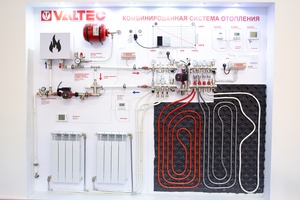 Стенд «VALTEC для котельной» был адресован всем, кто интересуется оборудованием для отопления индивидуального дома. Он демонстрировал обвязку котла, выполненную с использованием труб из нержавеющей стали, укомплектованную запорной, регулирующей арматурой, арматурой безопасности, циркуляционными насосами и автоматикой. Ключевыми элементами обвязки стали гидравлическая стрелка и 4-ходовой смесительный клапан с «умным» сервоприводом.