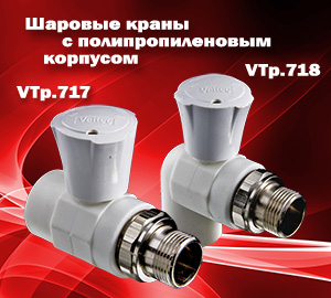 Специально для случаев, когда разводка системы отопления выполнена из полипропиленовых труб, в ассортимент торговой марки VALTEC включены шаровые краны с полипропиленовым корпусом VTp 717 (прямой) и VTp 718 (угловой). При оснащении ими радиаторов можно перекрывать поток теплоносителя через отопительный прибор (это основное назначение новинок) или осуществлять вручную грубое регулированное его теплоотдачи. Подключение крана к радиатору – резьбовое: на латунную никелированную закладную деталь с помощью накидной гайки закреплен полусгон (его наличие позволяет отсоединять радиатор без демонтажа крана). С полипропиленовой трубой кран соединяется методом раструбной сварки. Шаровой затвор и шток крана выполнены из латуни, затвор хромирован. Кран неремонтопригоден. Наработка на отказ – 5 тыс. циклов. Расчетный срок службы – 15 лет. Рабочая температура теплоносителя – до 90 °С, рабочее давление – до 10 бар.
