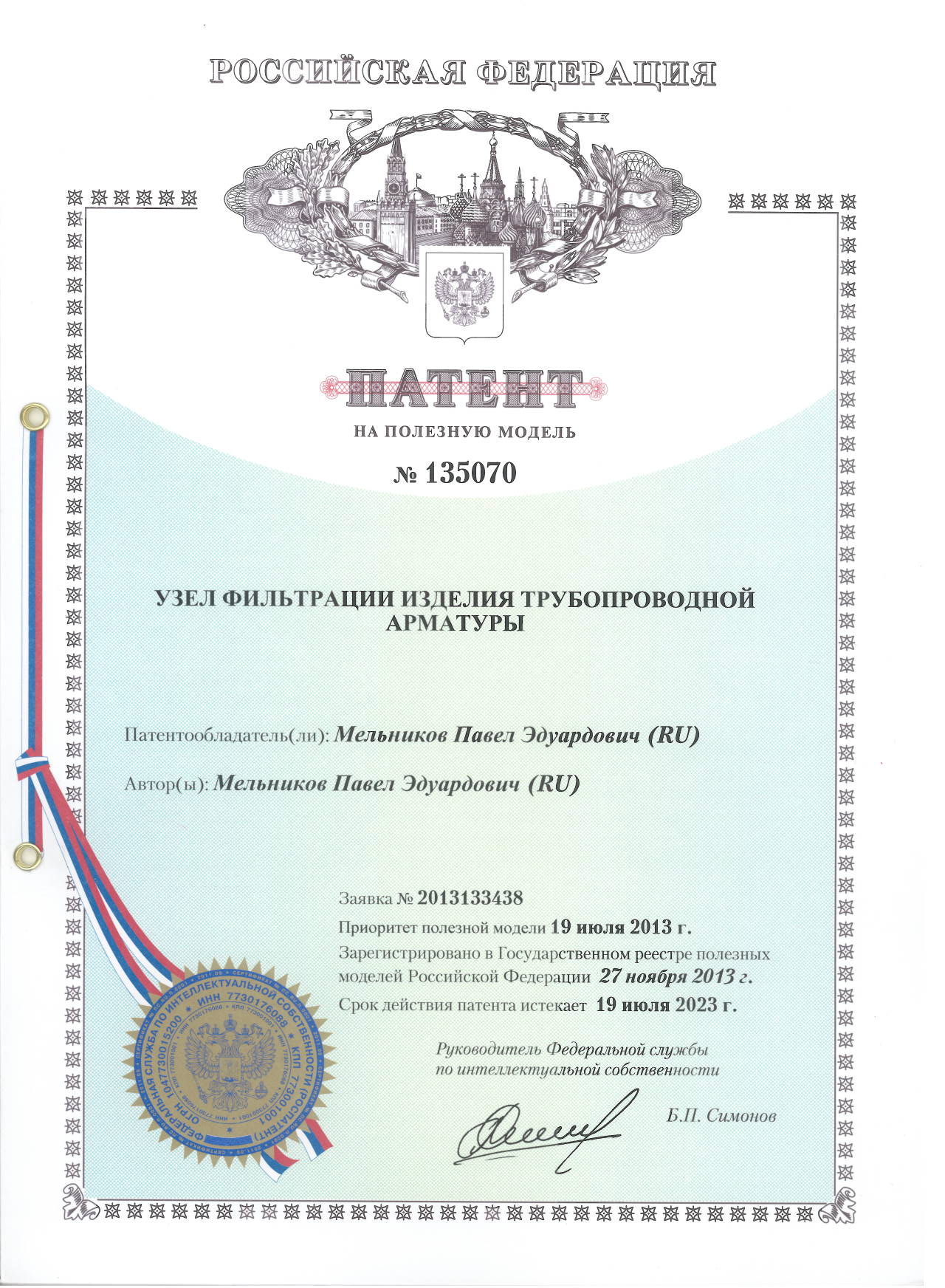 Патент № 135070. Автор: Мельников Павел Эдуардович.