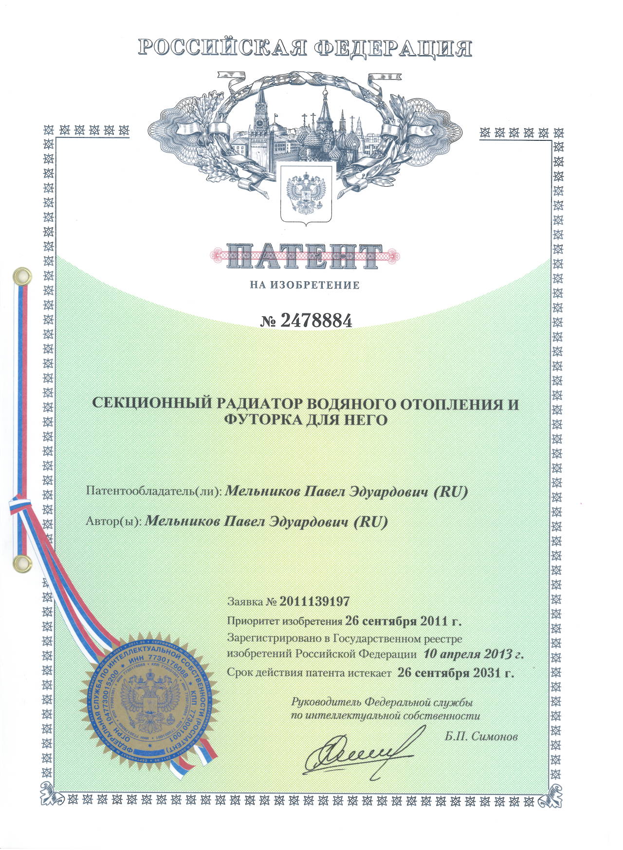 Патент № 2478884. Автор: Мельников Павел Эдуардович