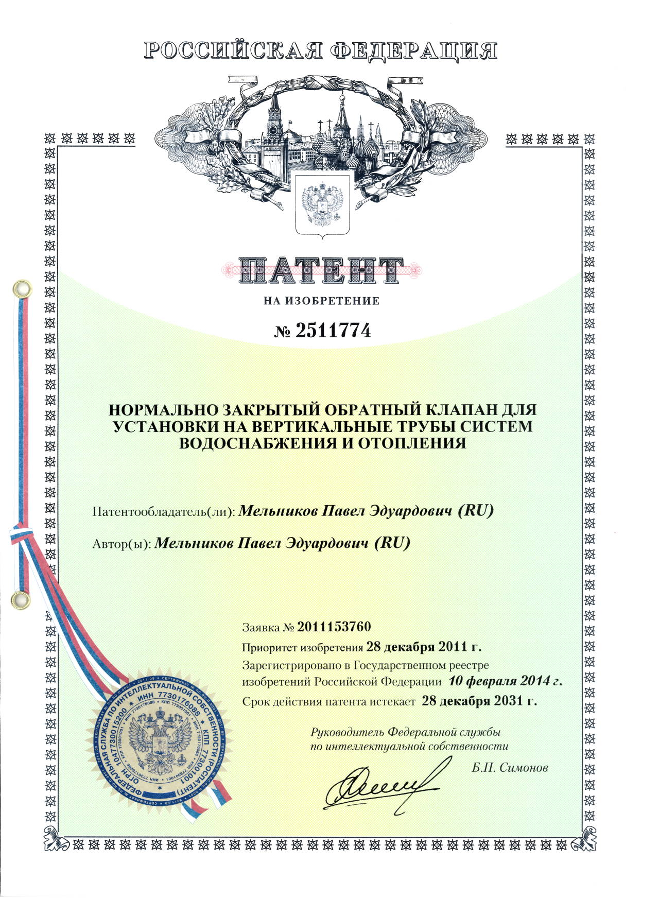 Патент № 2511774. Автор: Мельников Павел Эдуардович.